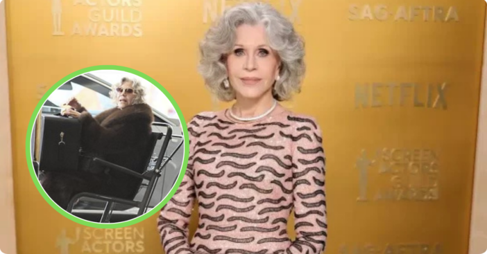 Jane Fonda’s wheelchair sighting captured her elegance in transit. She balanced two small bags on her lap as airline staff maneuvered her wheelchair, while her remaining luggage was placed on a trolley. Despite the practical circumstances, Fonda’s style remained impeccable, demonstrating that her public image endures alongside her activism.