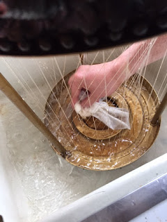 Unscrew the base pieces from the lamp. I placed the bottom “tub” and all of the foliage in hot water with Dawn soap to remove the oil and grime.